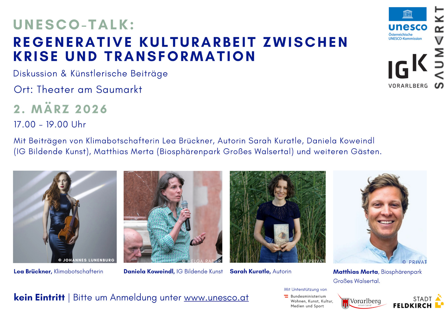 • UNESCO-Talk Regenerative Kulturarbeit zwischen Krise und Transformation: 17:00–19:00 Uhr, Theater am Saumarkt Feldkirch. Der Eintritt ist jeweils frei.
