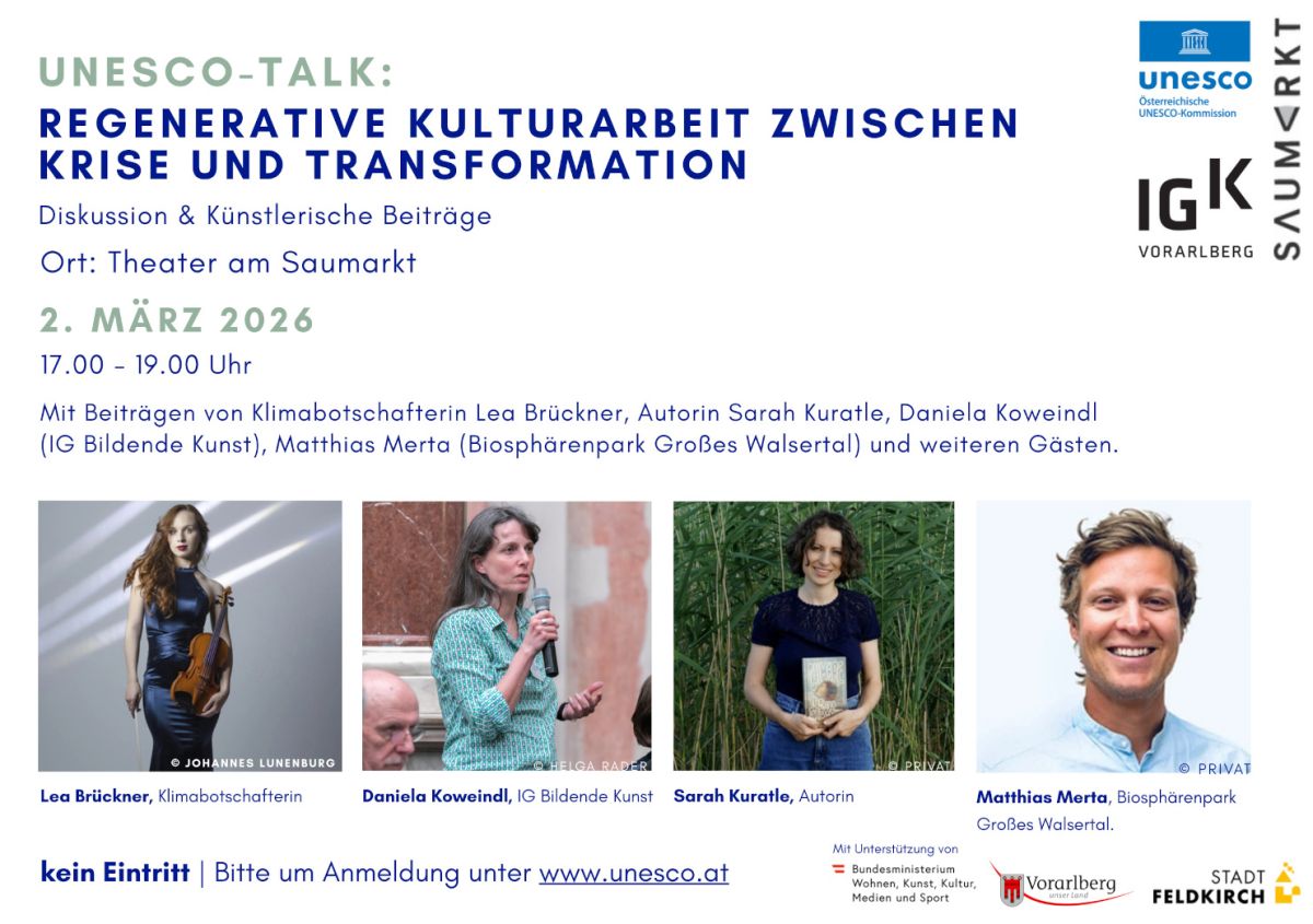 Unter dem Titel „Regenerative Kulturarbeit zwischen Krise und Transformation“ laden die Österreichische UNESCO-Kommission und die IG Kultur Vorarlberg am Montag, 2. März 2026 zu einem öffentlichen UNESCO-Talk ins Theater am Saumarkt Feldkirch ein. Mit der Beteiligung engagierter und international tätiger Persönlichkeiten wird die Frage erörtert, welchen gesellschaftlichen und ökologischen Beitrag Kunst und Kultur leisten und unter welchen Bedingungen sie zukunftstaugliche Entwicklungen mittragen.